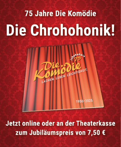 Darum ist in der Komödie kein Abend wie der andere. Hier erlebt man Schauspielkunst hautnah, hier spürt man eine unvergleichliche Atmosphäre, hier spielt das Leben – auf höchst unterhaltsame Art. Das gibt es nur im Theater. Hier gibt es keine Wiederholungen, keine Werbeunterbrechungen und keine Computeranimationen. Hier ist alles echt. Echt lustig. Echt einzigartig. Echt kultig!